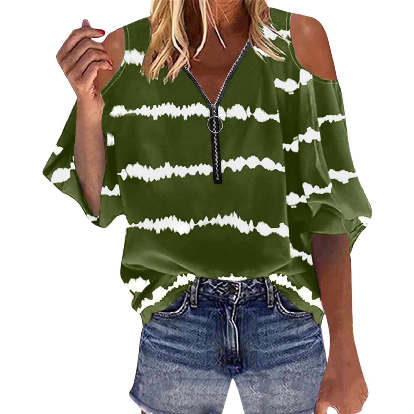 • Features: Off-the-shoulder; zipper; V-neck; three-quarter flared sleeves; loose fit shirt.