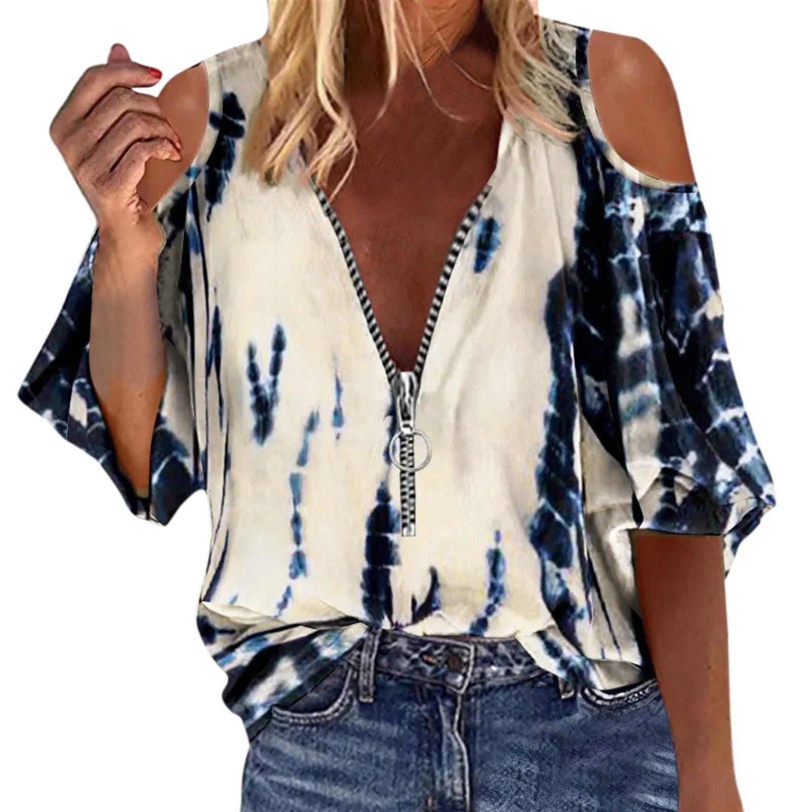 • Features: Off-the-shoulder; zipper; V-neck; three-quarter flared sleeves; loose fit shirt.