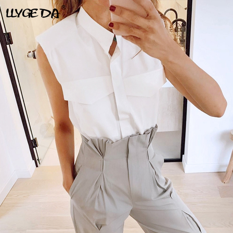 Home > White Sleeveless Shoulder Padded Shirt Female Stand Collar Pockets Elegant All-match Women shirts 2021 Summer Casual Fashion Top