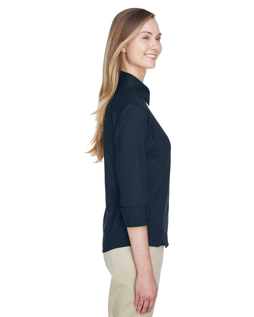 3.7 oz.; 97% cotton; 3% spandex; Classic feminine shape for a flattering fit; Fine stitching throughout; Delicate; pearlized buttons on front placket; Back yoke; Princess seams; Bust darts; Three-quarter sleeves with fold-up cuff detail;